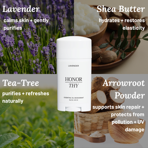 Lavender, Tea Tree, Arrowroot Powder, Shea Butter, Baking Soda, Organic Beeswax, Coconut Oil, Jojoba Seed Oil, Vitamin E.